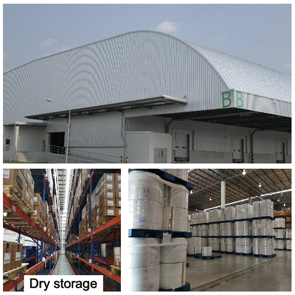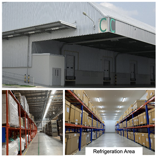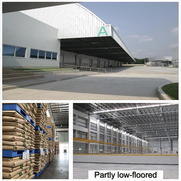 各棟の前面には奥行15mの下屋がありますので、タイ特有の急なスコールでお客様の商品を濡らすこともありません。梁下高はA棟、B棟が12m、C棟が8m、床の耐荷重はそれぞれ1.8t/㎡です。各棟の出入口には指紋認証の電子錠、監視カメラを設置、機械警備に加え、24時間体制の有人警備配備でセキュリティには万全を期しています。
